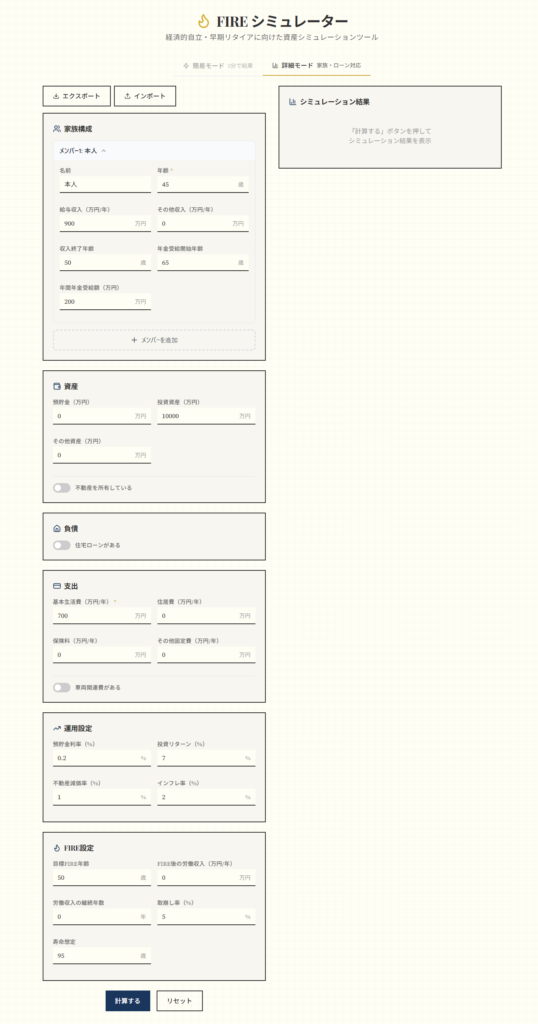 - 家族構成: 複数のメンバーを追加できる。それぞれの収入、収入終了年齢、年金受給開始年齢、想定年金受給額を設定可能